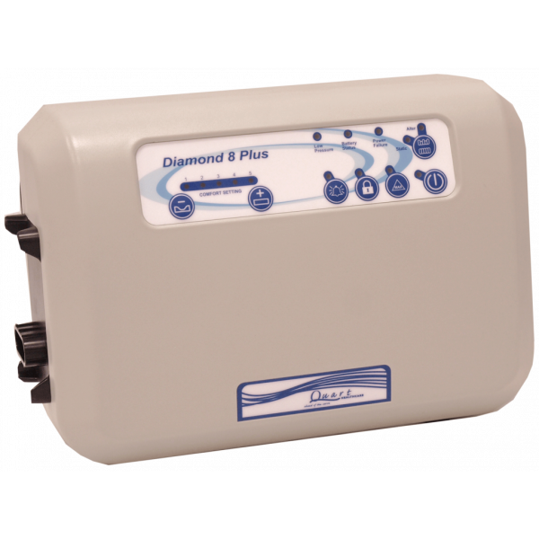 The Diamond 8 Plus is a high-capacity (650 lbs) alternating “micro” low air loss mattress replacement system designed to prevent and treat Stage I–IV pressure wounds, especially in the coccyx and lower back. It features an advanced 3:1 alternation cycle with 18 deep figure‑8 cells that maintain constant support, a 21‑minute pre-set cycle, and a built‑in two‑hour battery backup. The mattress provides five comfort settings, static and auto-firm modes, and visual/audio alarms for safety. Its vapor‑permeable cover wicks away moisture through 20 micro air loss openings, and the lower cell layer stays inflated up to 72 hours during power loss. Regular monthly filter cleaning is recommended.